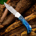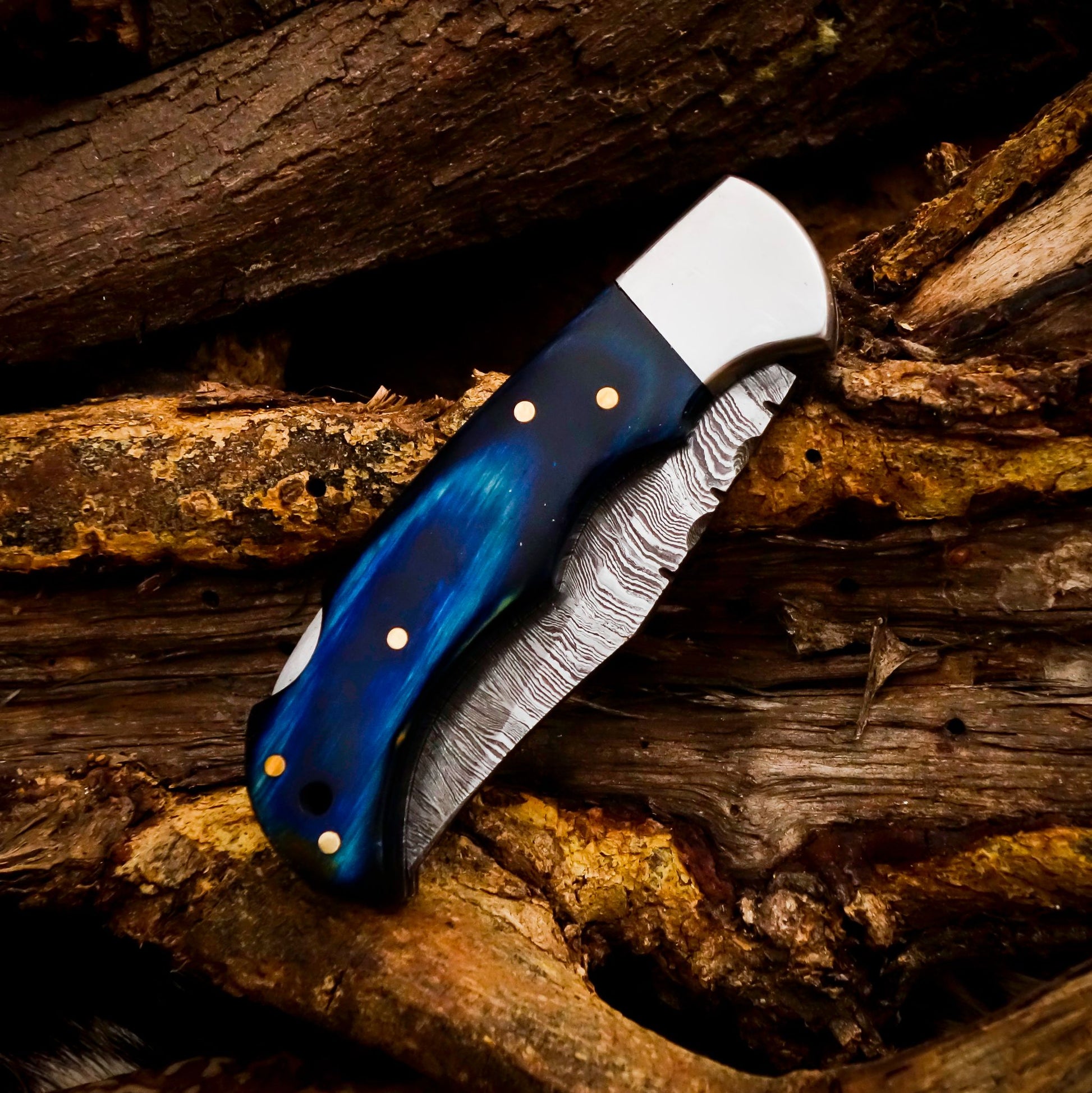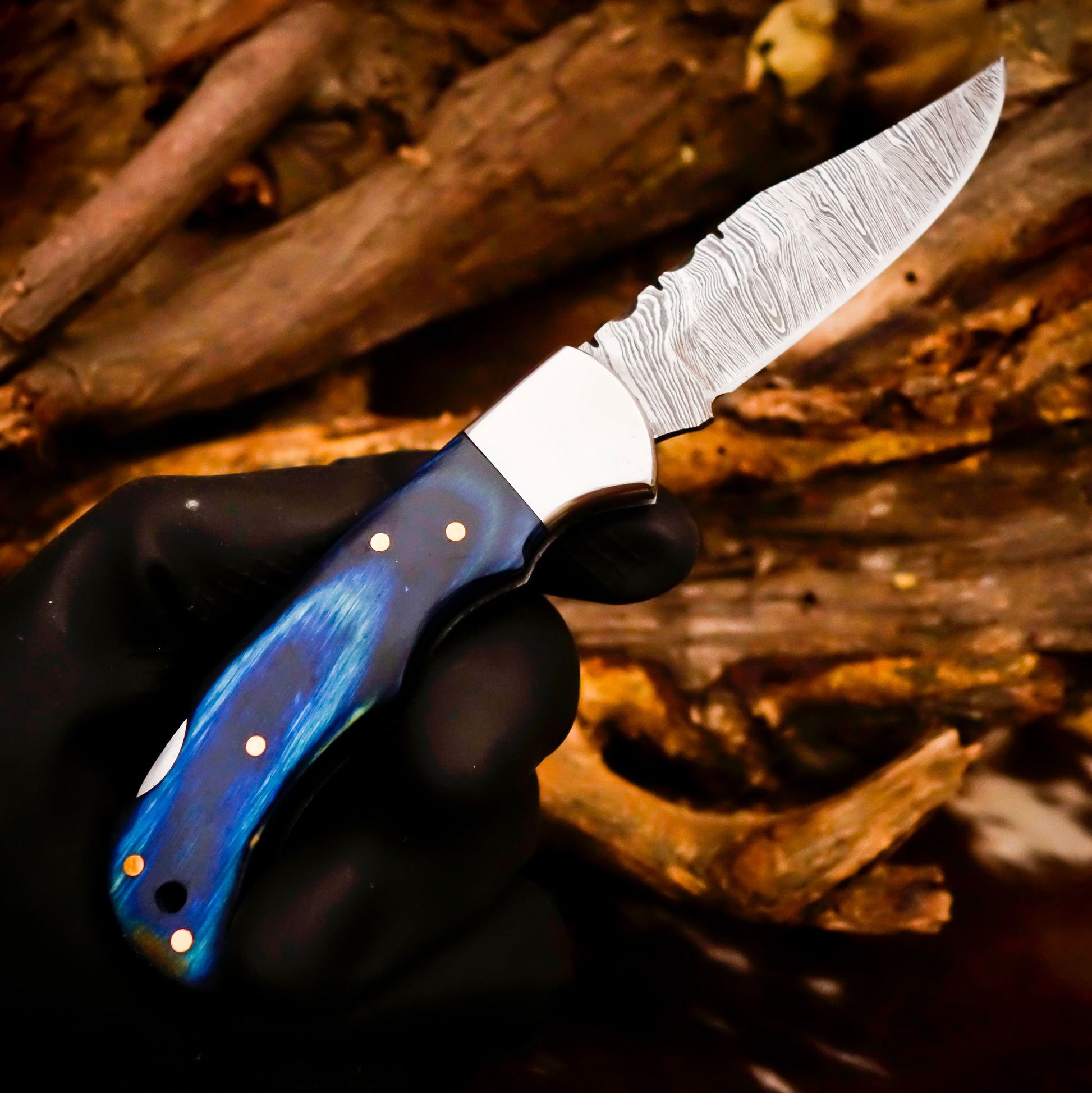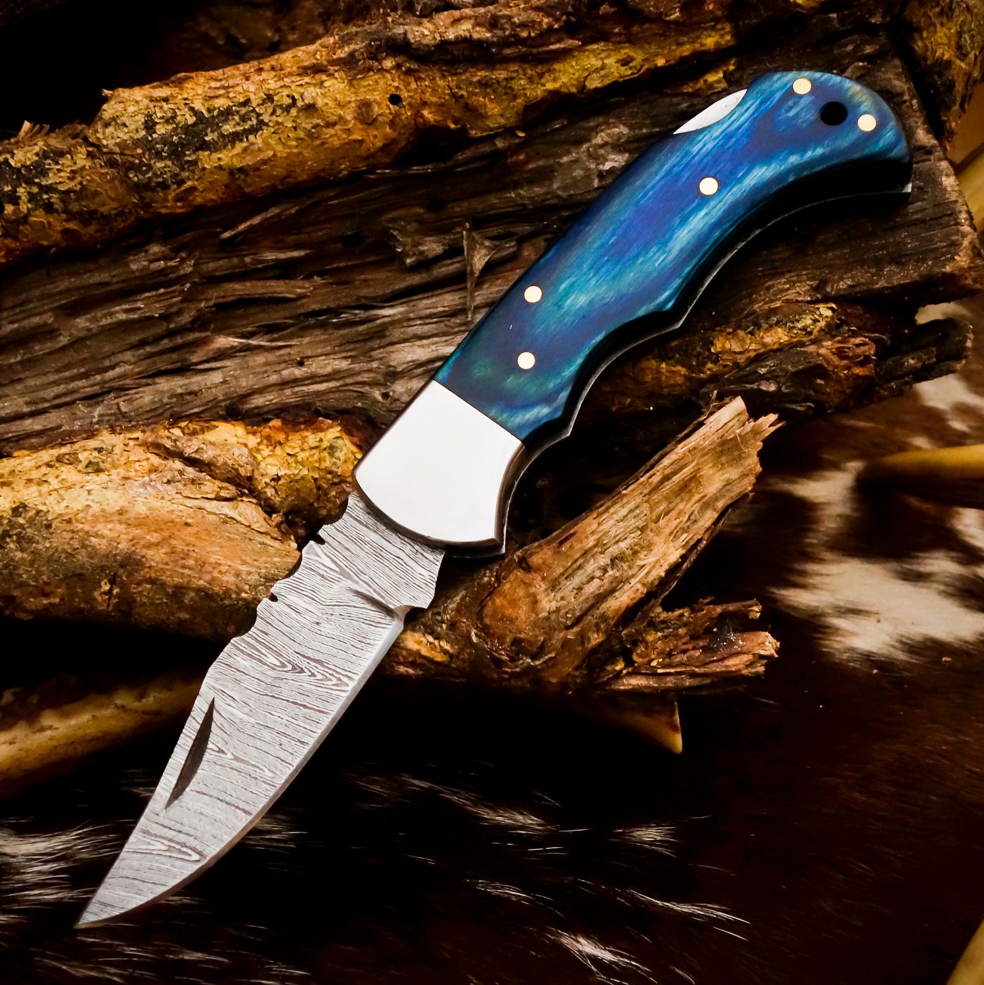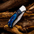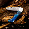 Damascus Steel Folding Pocket Knife - Blue Wood Handle, 7" with Leather Sheath for Hunting & Camping