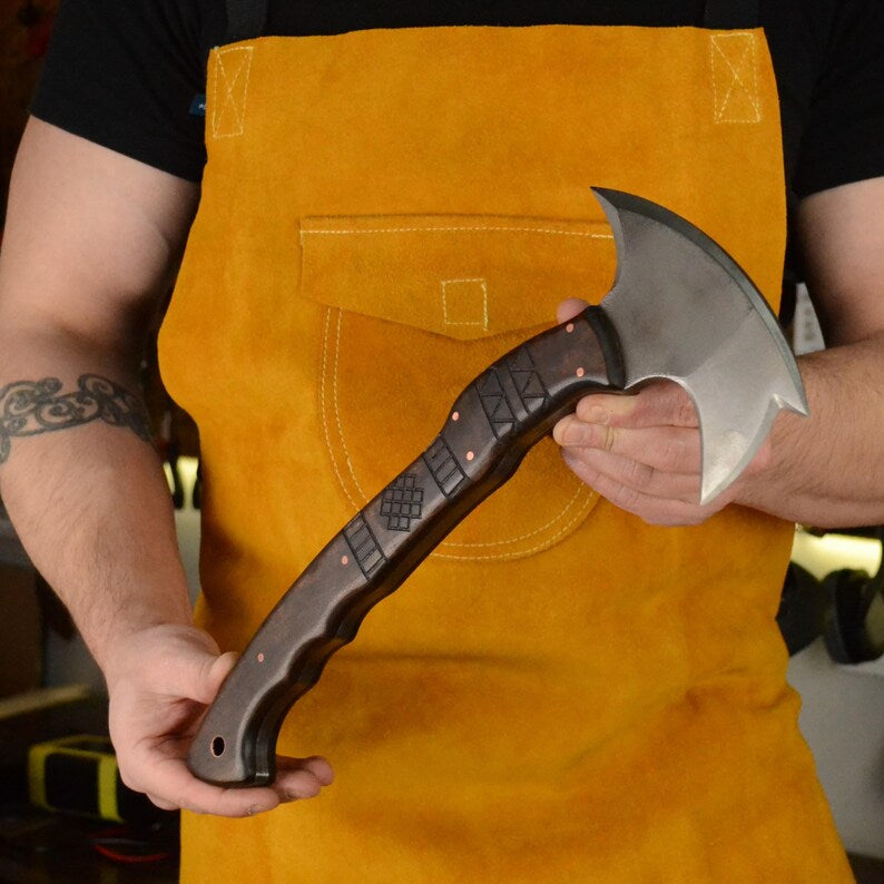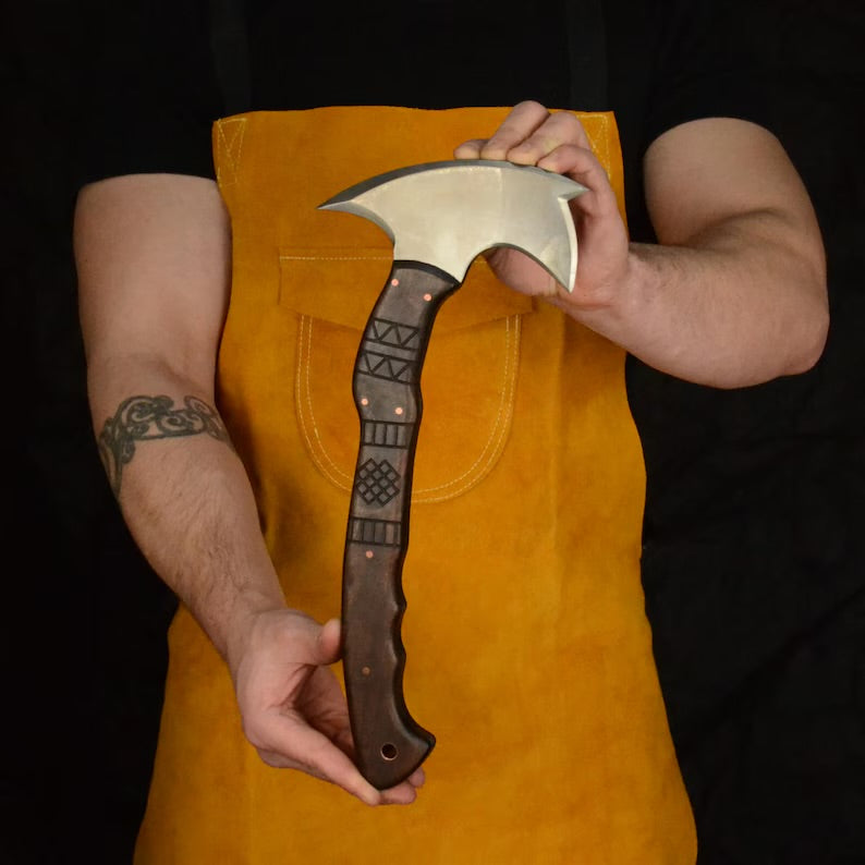 Elevate your outdoor adventures with our handmade bushcraft tomahawk, expertly crafted for durability and functionality. This full tang tomahawk features a robust design, making it ideal for camping, hiking, and bushcraft activities. Complete with a protective sheath for easy transport, this functional axe is designed to tackle a variety of tasks with ease. Personalize it with custom engraving to create a unique gift for outdoor enthusiasts, making it perfect for birthdays, holidays, or special occasions. Experience the perfect blend of craftsmanship and practicality with this exceptional handmade tomahawk that is built to last.
