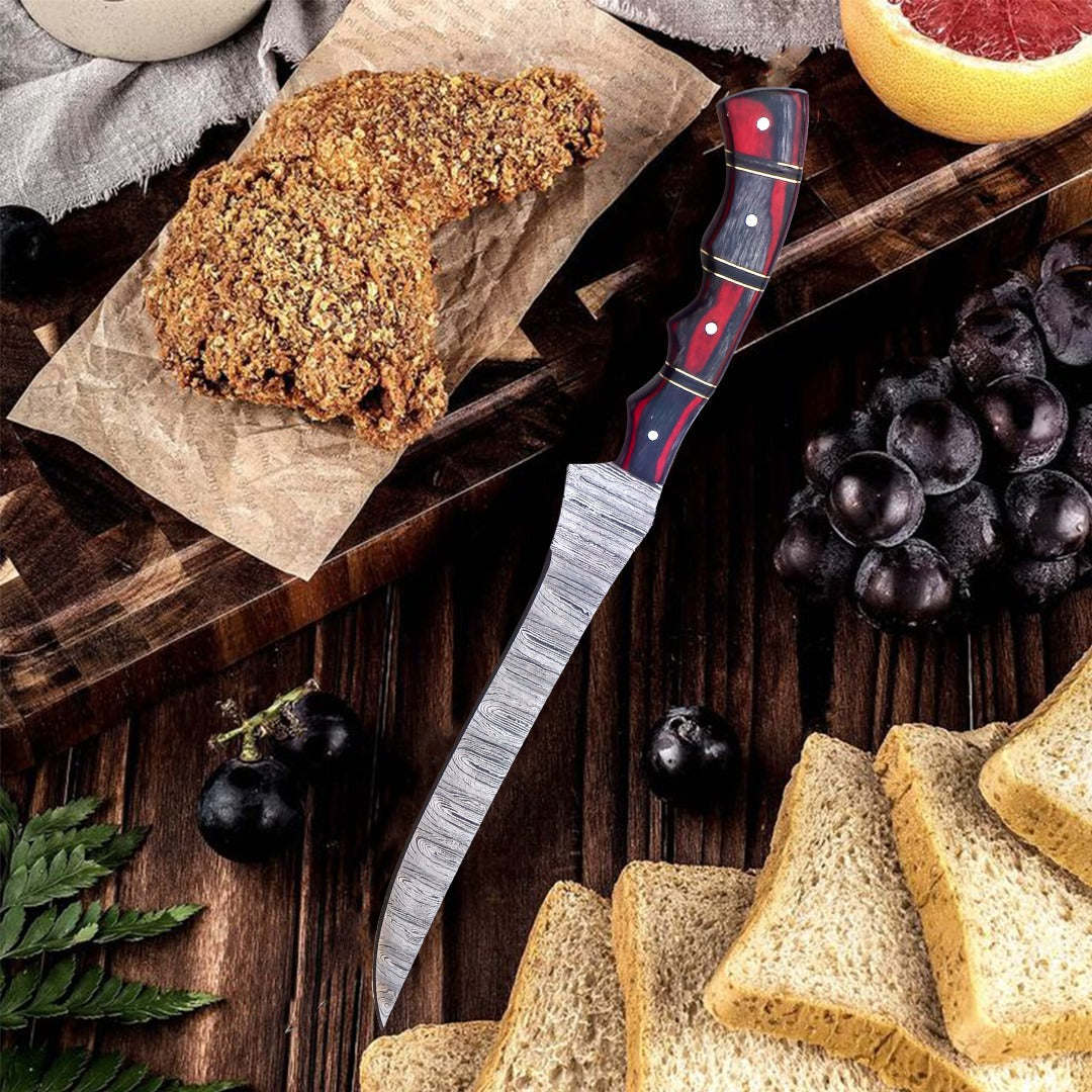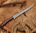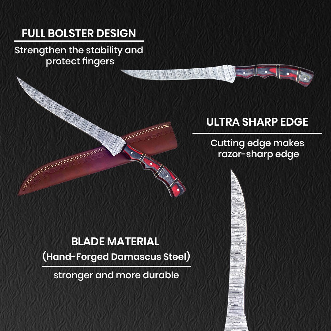 Hand-Forged Damascus Steel Fillet Knife - 13" with Red Pakka Wood Handle, Rust-Free & Precision-Crafted for Filleting