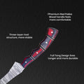 - Ergonomic Handle: The red Pakka wood handle is designed for a secure, non-slip grip, while the fiber and brass accents provide both durability and aesthetic appeal.
