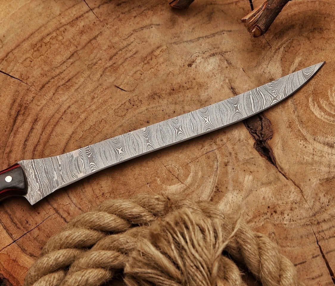 ABW Craft’s Hand-Forged Damascus Steel Fillet Knife is your ultimate companion for filleting fish, boning meat, or adding a professional touch to your outdoor adventures. Featuring a 13-inch full tang Damascus steel blade, this handmade knife offers razor-sharp precision and exquisite craftsmanship. The handle, made from red Pakka wood with fiber and mosaic pin accents, is designed for a non-slip grip and superior balance. Whether you're fishing, cooking, or gifting, this stunning fillet knife is perfect for both outdoor enthusiasts and culinary aficionados.
